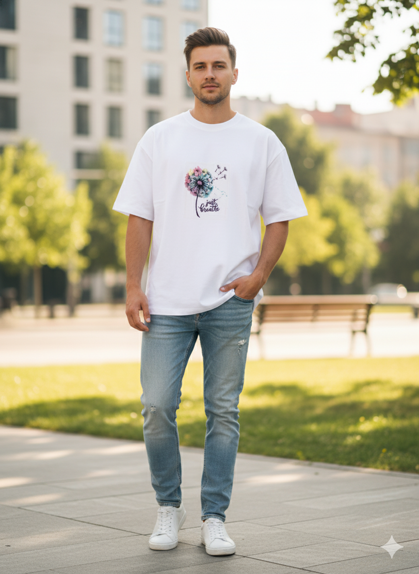Embrace a sense of calm and style with this White “Just Breathe” Drop Shoulder T-shirt. Featuring a vibrant, intricate dandelion embroidery with the uplifting message “Just Breathe,” this tee is designed for comfort and positive vibes. The oversized fit and crisp white color make it a versatile, standout piece for any casual outing.